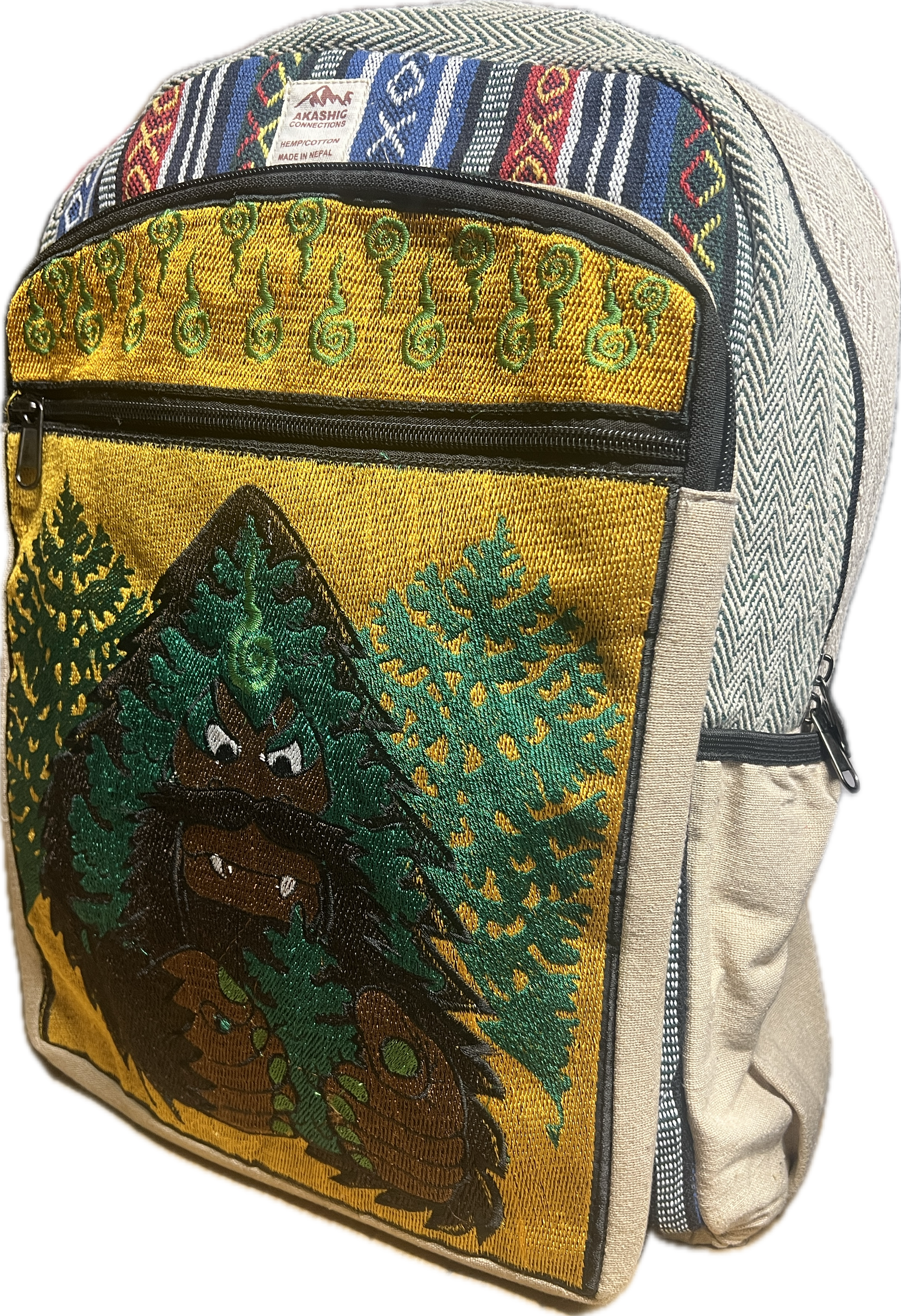 Amazing quality hemp and cotton backpack handmade in Nepal. All the embroidery was done with silk thread directly into the fabric. Designed by Bigfoot One out of Arizona, these backpacks are built to last.
